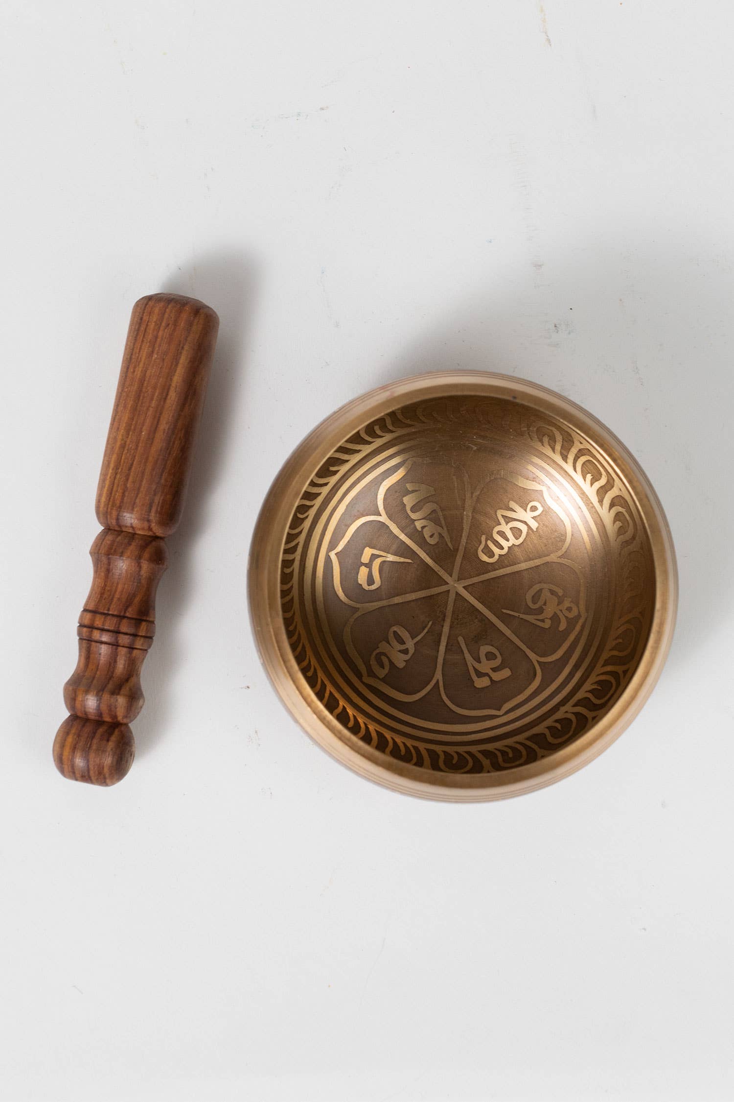 Singing bowls are idiophones that have been used in meditation and sound therapy for thousands of years. The Calm Wisdom Singing Bowl is handcrafted in Nepal by artisans whose singing bowl casting knowledge is vast and generational. The bowl is inscribed both on the inside and outside in Tibetic with the Buddhist chant, "Om Mani Padme Hum," which boasts a syllable that focuses on each of the practices of Buddhism from generosity to wisdom. The chant is said to focus the individual on achieving perfection in each practice and bringing one to a purer existence. The Yin Yang on the under side of the bowl remind us to seek balance—that life is most fulfilling when we embrace the dark with the light, the difficult seasons with the joyous.