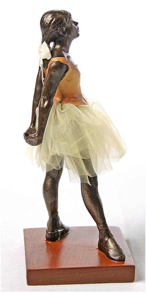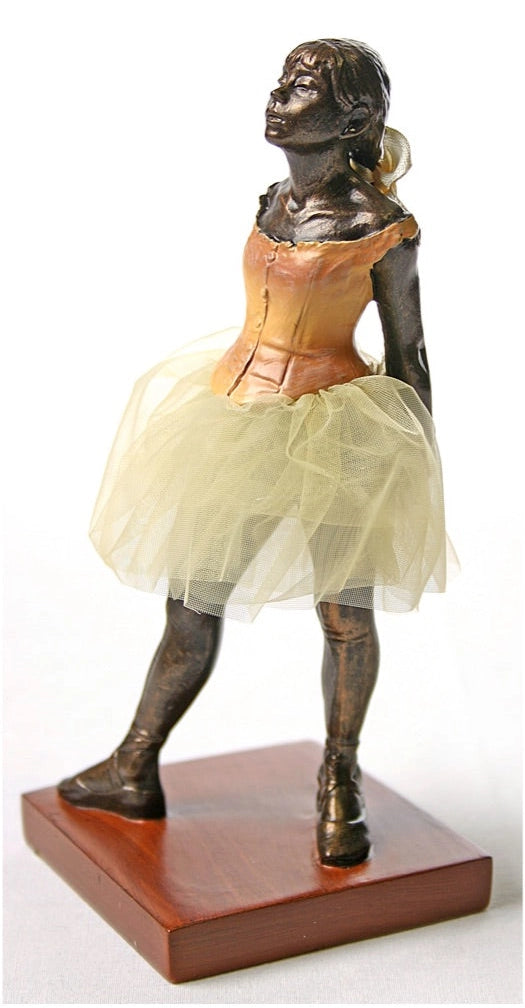 Petite Danseuse De Quatorze Ans (Little Dancer of Fourteen Years, 1879-1881), is the only sculpture Edgar Degas chose to exhibit throughout his lifetime. He created a revolutionary piece breaking the stereotypical cold inanimate sculptures of his time. He made his dancer come to life. Although received with some disapproval because of its stark realism, it has become one of the most time honored, beloved sculptures around the world.