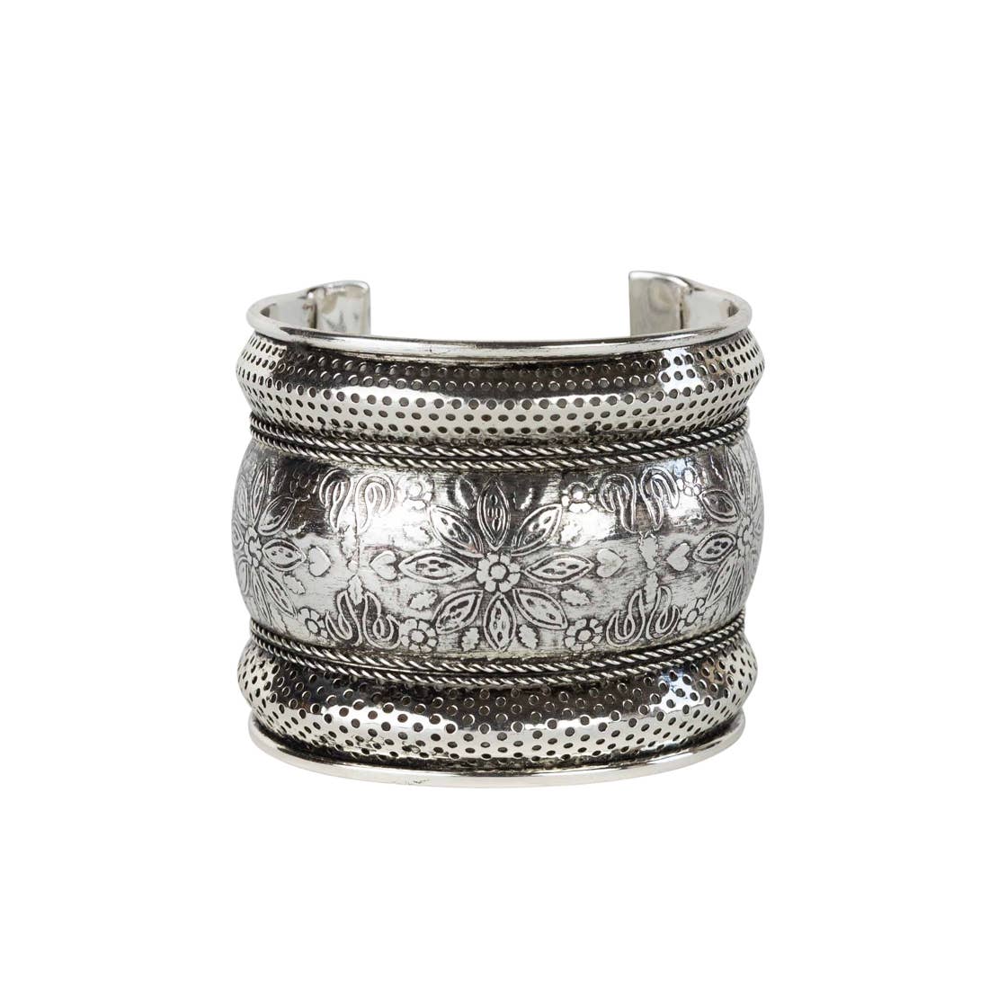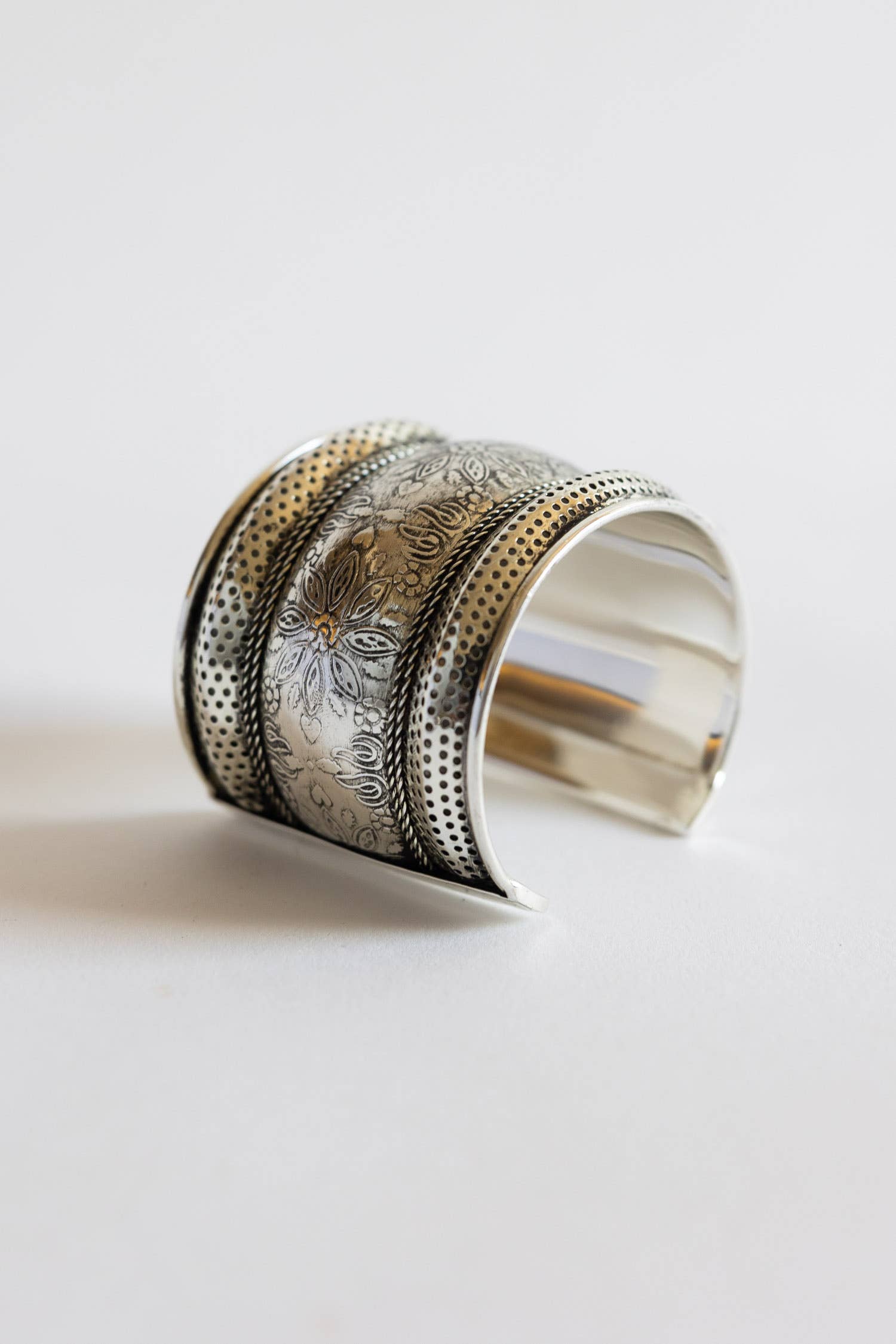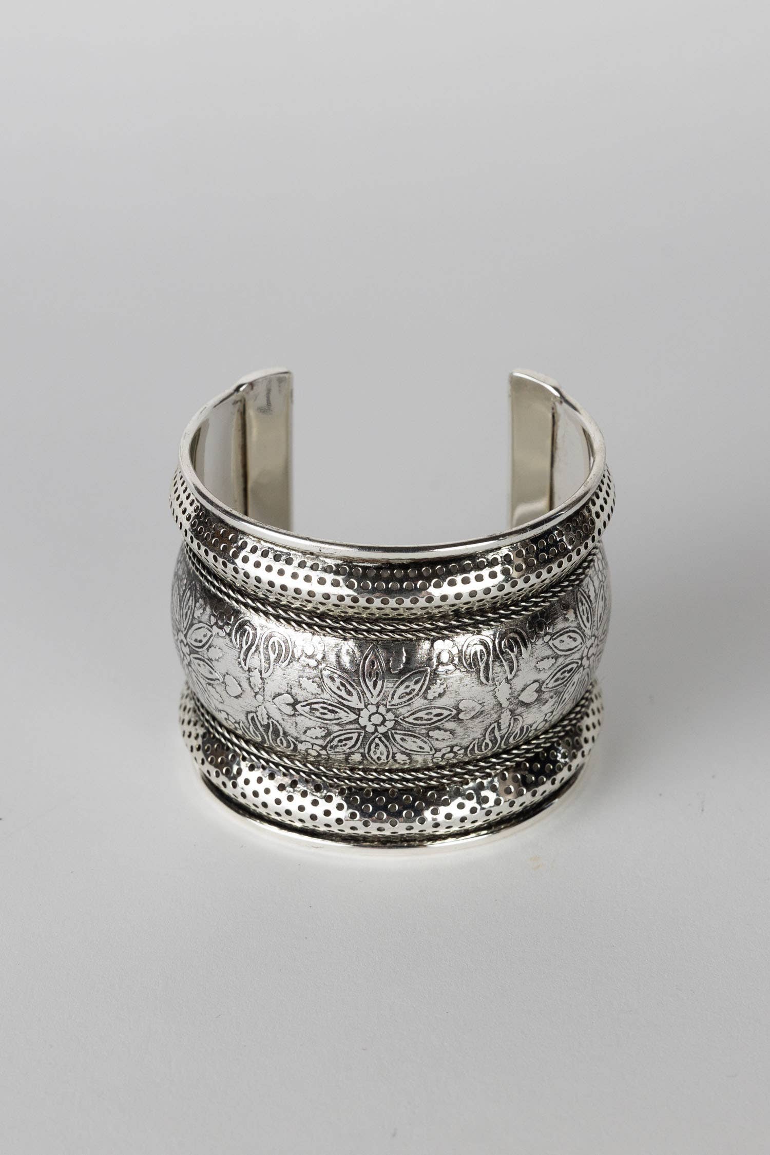 Power up with this silver cuff bracelet with an intricately embossed floral design. Handcrafted by artisans in India with TARA Projects, working with hundreds of artisans: paying fair wages, providing medical insurance, interest‒free loans and advances, a savings program, and skills training. Materials: Brass - Measures: 2.25"W - Colors: Silver - Handcrafted in India