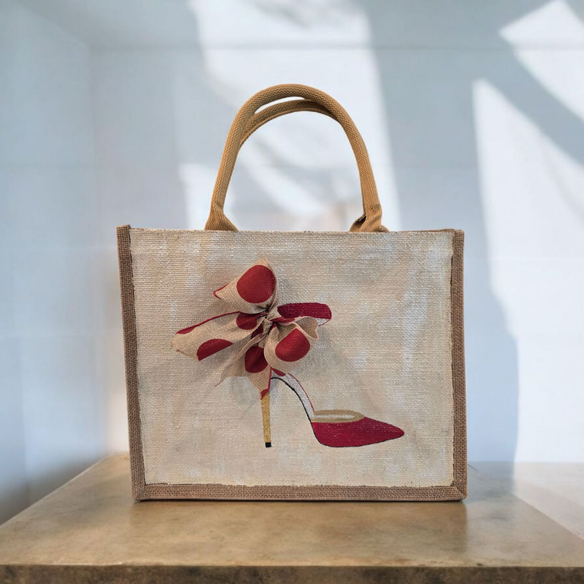 Hand-Painted Red & Tan Polka Dot Canvas Tote with Stiletto Design - Stylish and Unique Stand Out Style: Introducing our Hand-Painted Red & White Polka Dot Canvas Tote, featuring a chic stiletto design. Each tote is a one-of-a-kind creation, blending functionality with fashion-forward artistry. Product Highlights: • Artisan Craftsmanship: Every bag is individually hand-painted, ensuring a unique design. • Durable Material: Made from high-quality burlap, jute canvas to withstand daily use. • Spacious & Practical: Generous interior space perfect for shopping, work, or a day out. • Eco-Friendly Choice: Reusable and sustainable, making it an environmentally conscious accessory. Deminsions: 15” x 16” with 21” handles. Care Instructions: Spot clean with mild detergent, air dry.