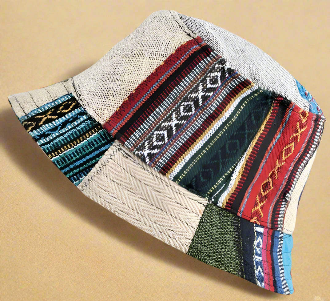 Picture a hat that's like a treasure map for your head. This isn't just headwear; it's a patchwork journey through Nepal's textile traditions, all wrapped up in a cozy bucket shape. The base, a sturdy natural fabric, holds it all together like the timeless traditions that bind Nepalese culture. Each stitch is a brushstroke, transforming this humble hat into a wearable masterpiece. This isn't just a hat for shading your eyes. It's a conversation starter, a culture carrier, and a reminder that sometimes the most beautiful things come from bringing diverse pieces together. Pop it on your head, and suddenly you're not just wearing a hat - you're wearing a little piece of Nepal's vibrant soul.