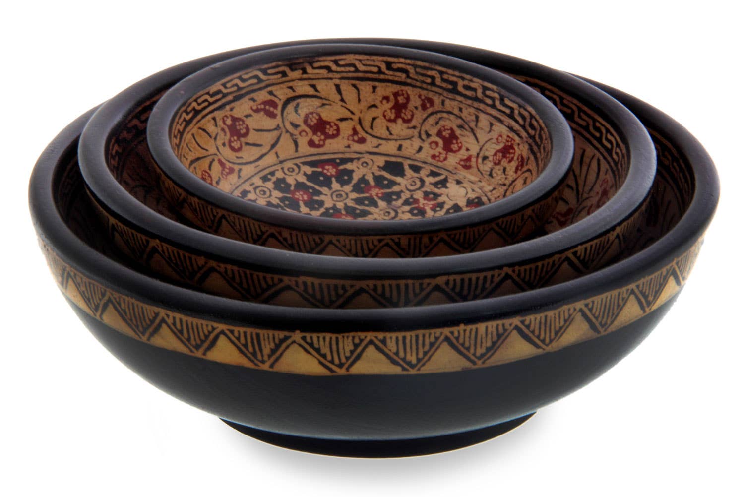 From Gunadi, these decorative bowls showcase the ancient Javanese art of batik. Three centerpieces in graduated sizes are carved from native wadang wood. The motif is called truntum, and represents the jasmine bud. This motif is usually worn by the parents of the bride and groom, as its meaning is "to guide."