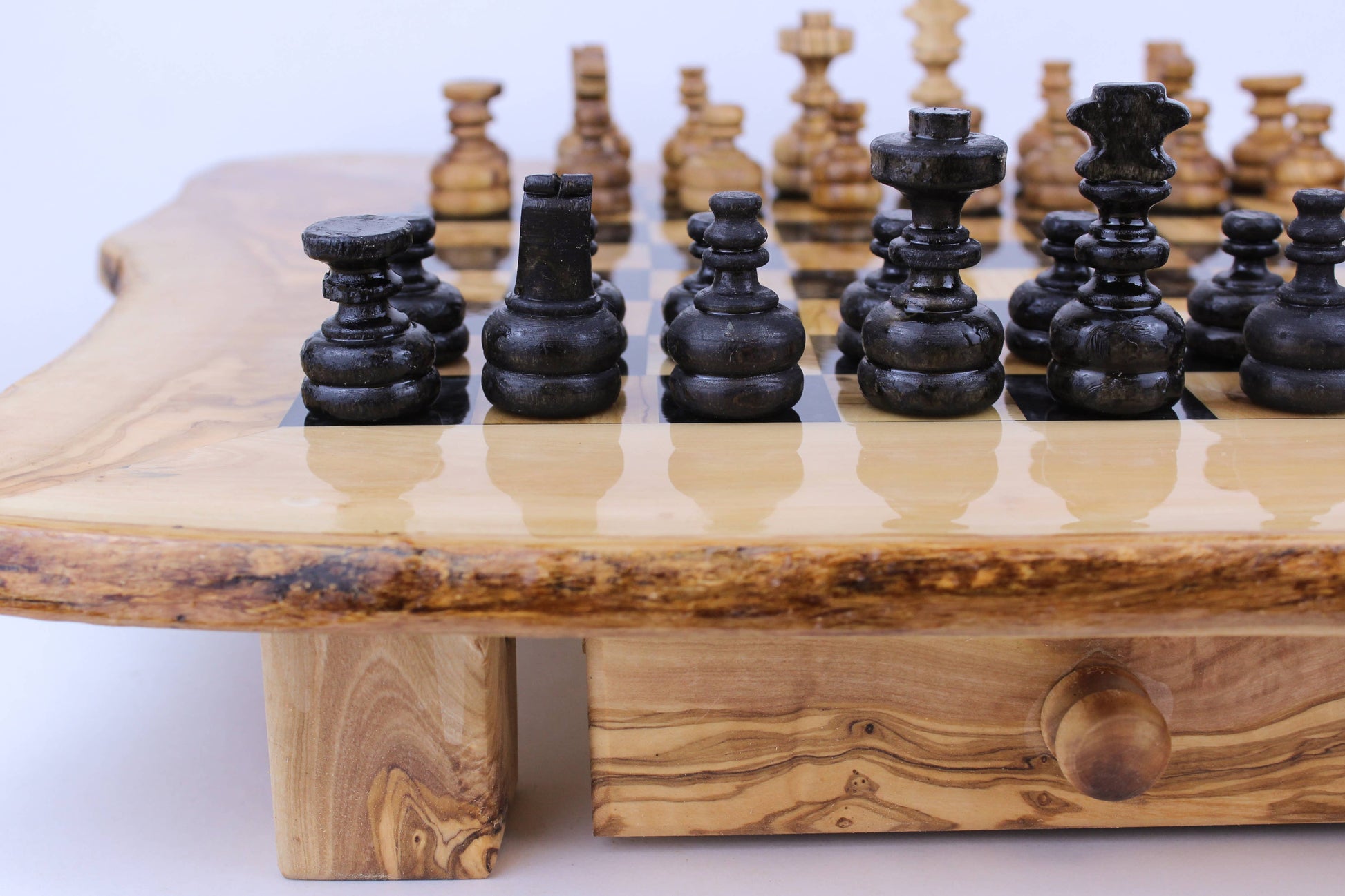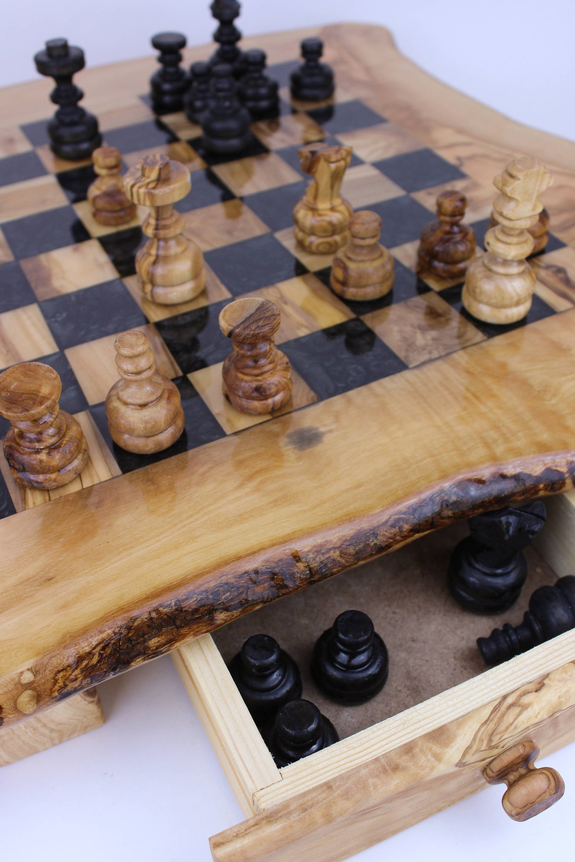 Introducing the stunning Olivewood and Resin Chess Board, the perfect combination of timeless elegance and contemporary design. Crafted by skilled artisans, this unique chess board is a masterpiece that will captivate your senses with its exquisite beauty and impeccable craftsmanship. Made from the finest quality Olivewood, each piece of wood is hand-selected for its unique grain patterns and natural beauty. The Olivewood is then seamlessly paired with an eye-catching black resin finish, creating a one-of-a-kind piece that exudes luxury and sophistication. The chess board sits on sturdy legs, providing a stable base for hours of strategic gameplay. The two spacious drawers conveniently store the pieces, ensuring they are safe and secure when not in use. The set comes complete with the chess pieces, each piece handcrafted to match the beauty and quality of the board.