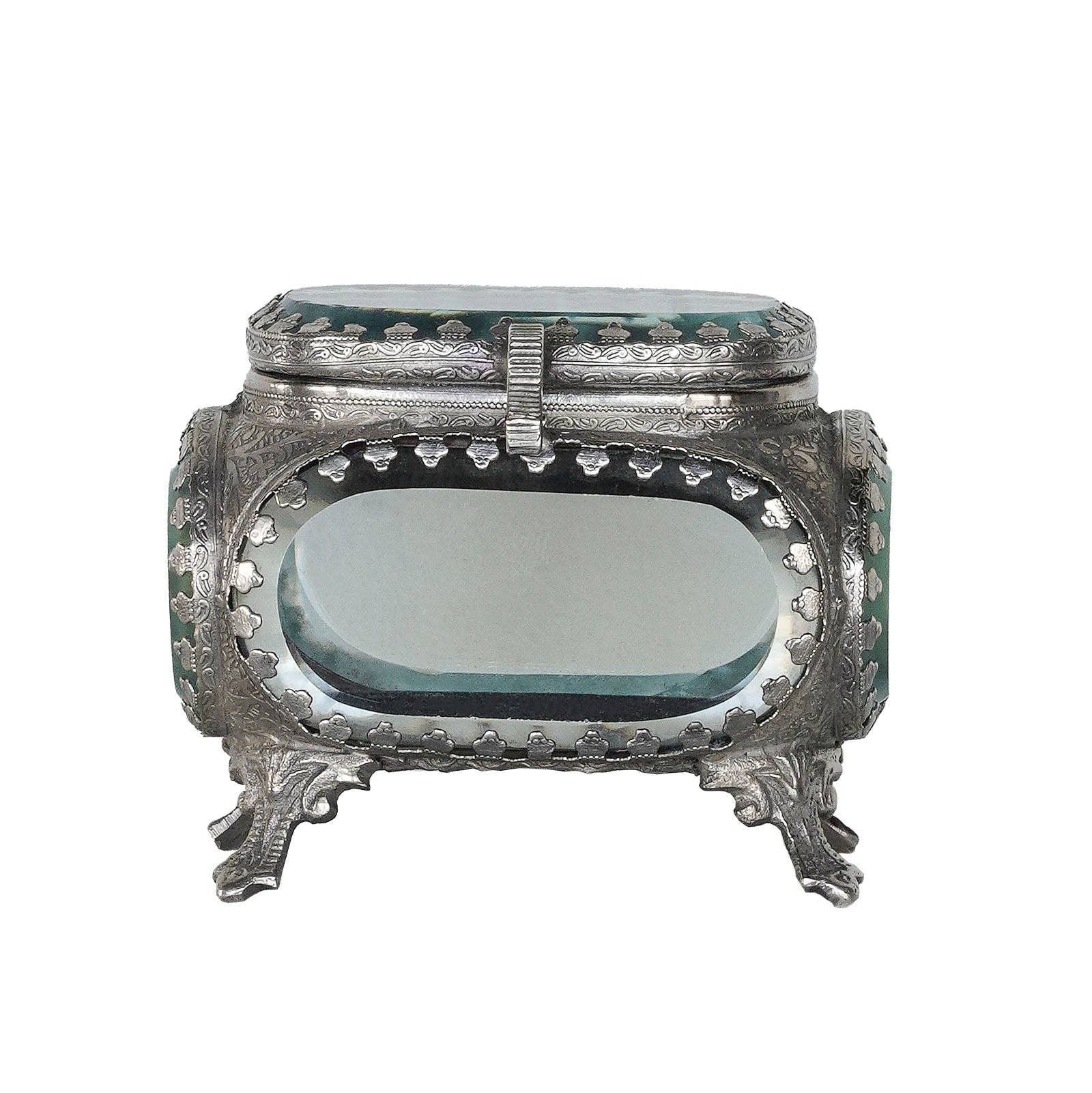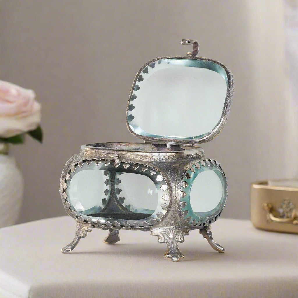 Petite in stature but stately in design, the Ormolu Box with Feet is rectangular with rounded sides. The glass enclosure is framed in antique silver-finished framing, with claw-feet and filigree edging.