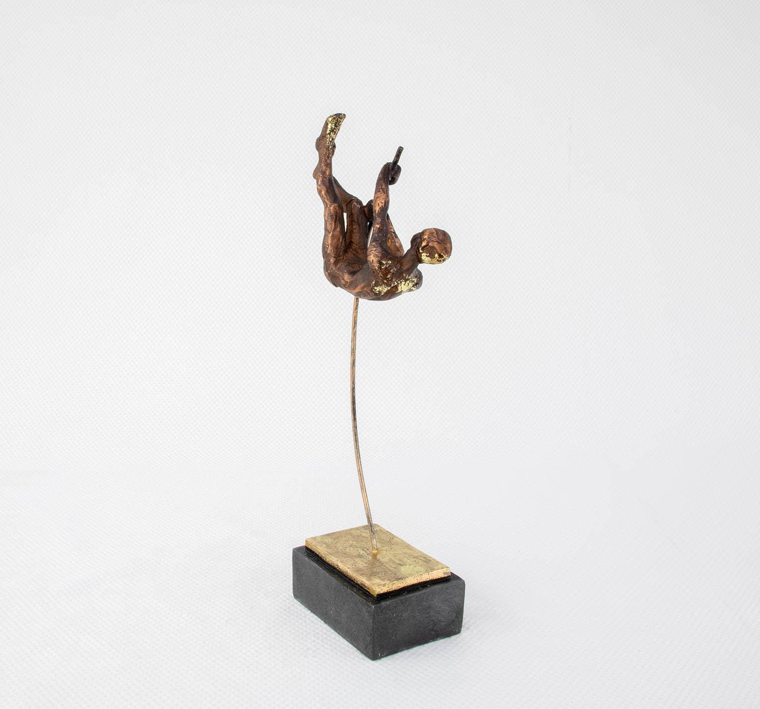 Capture the essence of strength, agility, and determination with this Pole Vaulter Sculpture, a dynamic representation of athletic excellence. Crafted with a bronze finish, this striking piece showcases a male athlete in mid-action, soaring with precision and grace. The sculpture is set on a gold plate base, adding an element of sophistication, while the dark stand provides depth and contrast, making it a commanding centerpiece for any space.