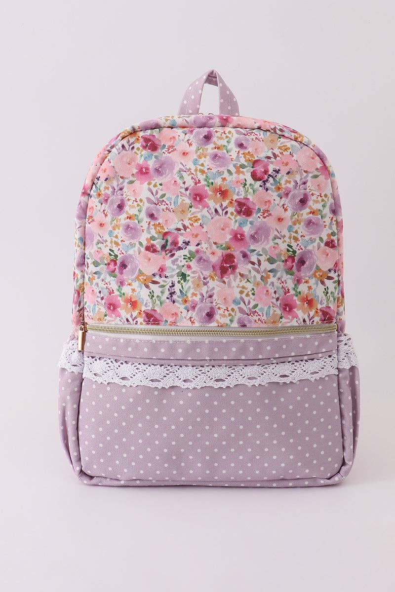 Purple floral print canvas ruffle backpack