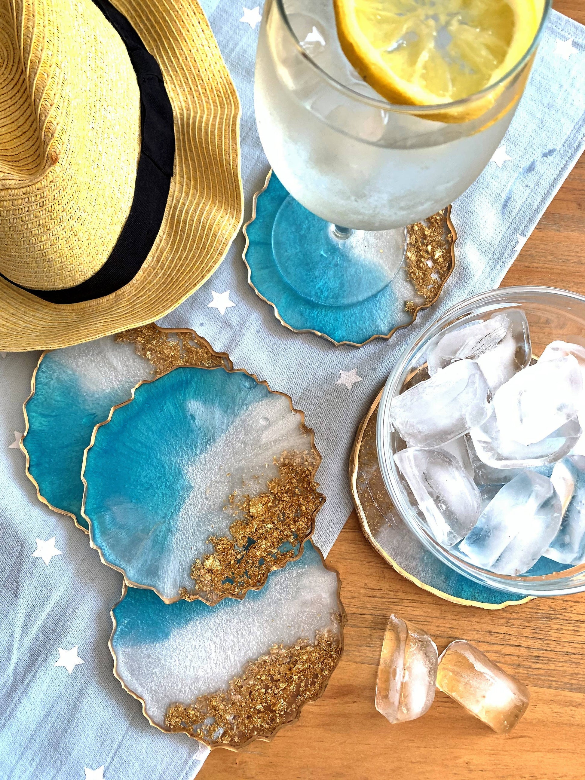Because size matters... These large, vibrant colored coasters sets are fun and very decorative! They feature a gold stripe, a white stripe and a third color of turquoise. They safely hold cold or hot drinks. Hand wash. Set of 4 presented in a muslin bag. Color: Turquoise