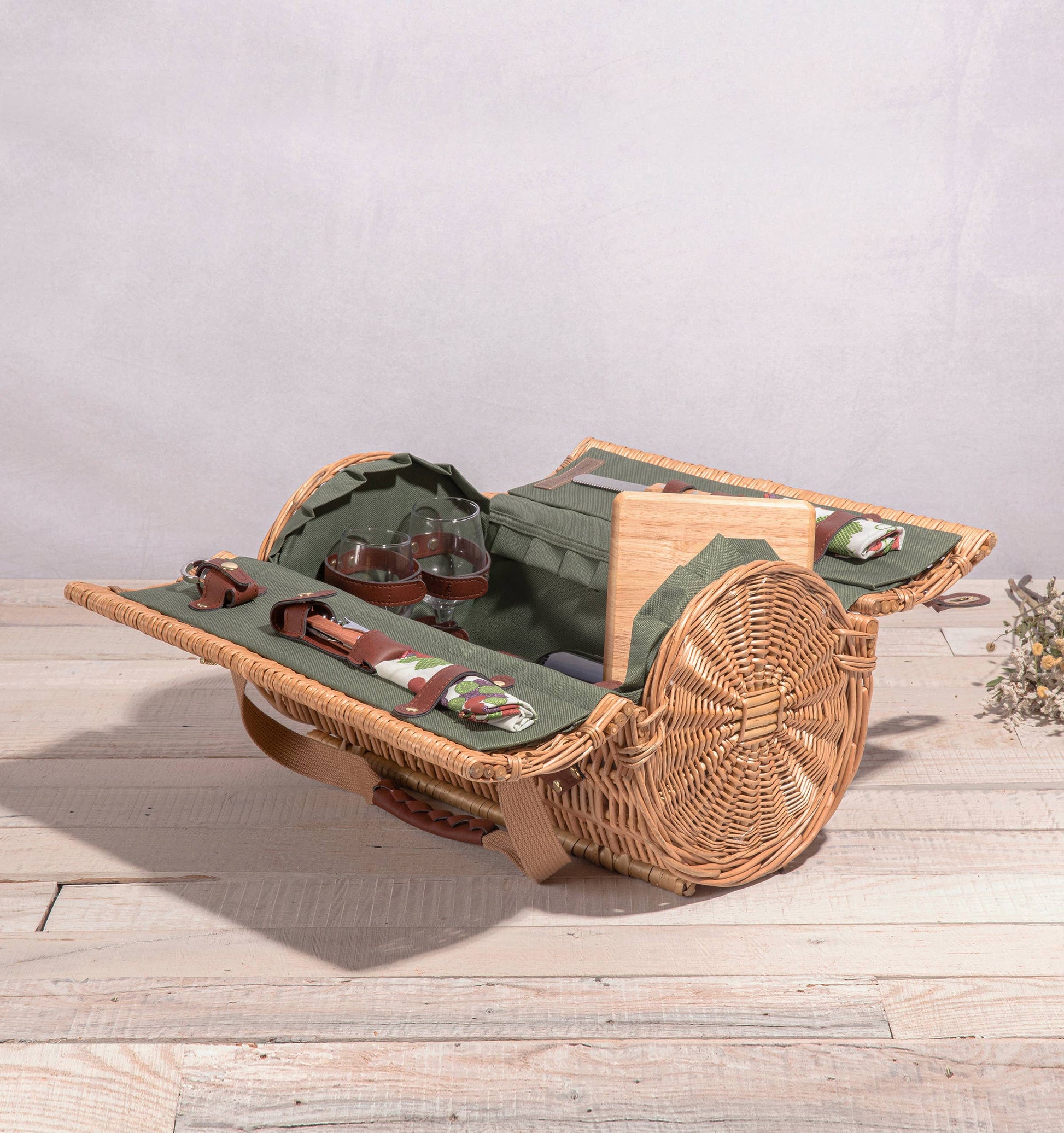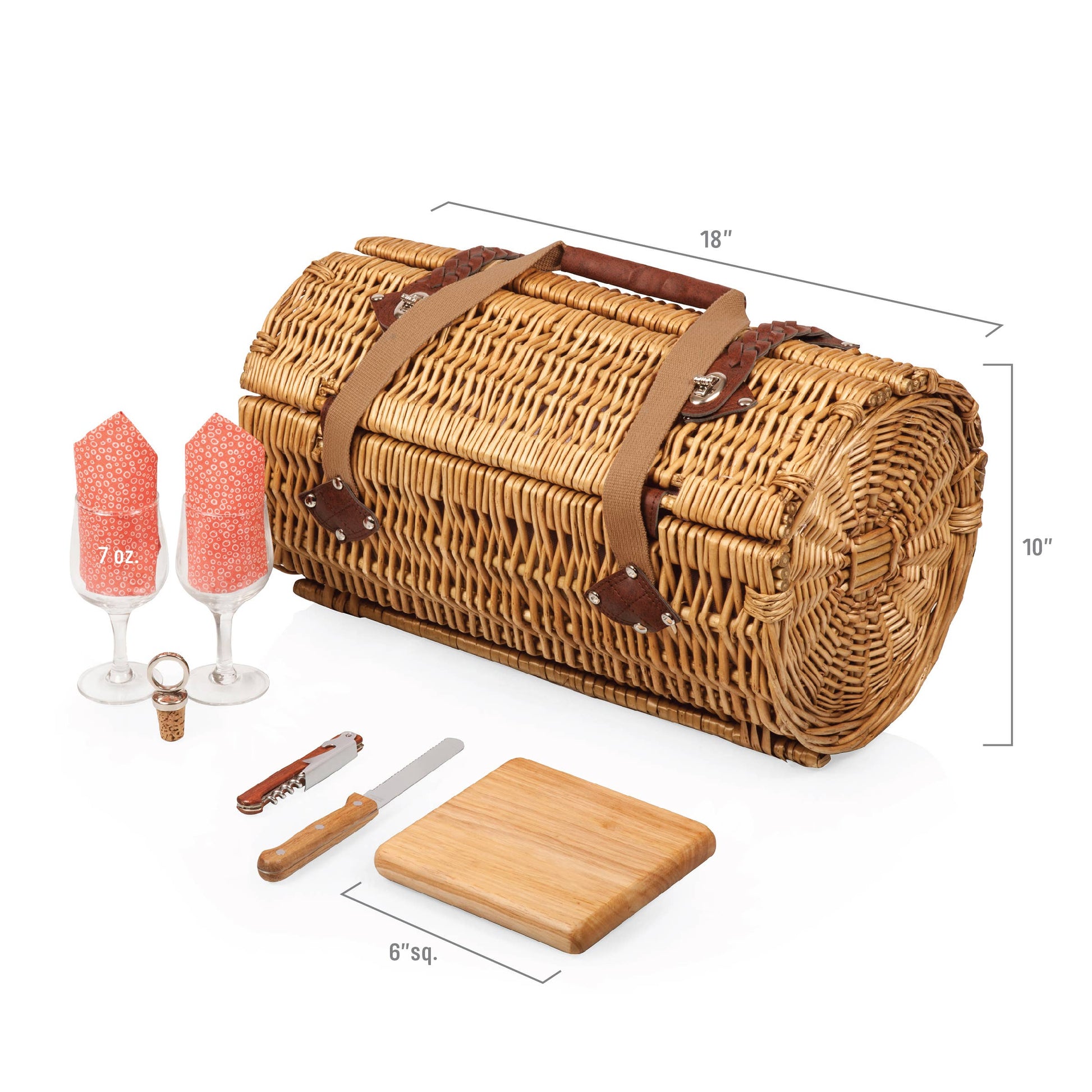 The Verona Wine & Cheese Picnic Basket is a handwoven wicker picnic basket worthy of a sonnet. A classic English-style wine basket, this compact yet roomy willow barrel contains everything you need for a wine, cheese and charcuterie service for two. Picnic set includes 2 wine glasses, silverware set for 2, wood cutting board, wood-handled cheese knife, a nickel-plated cork bottle stopper, and waiter-style corkscrew. The durable polyester lining and cotton napkins come in matching colorways for vintage-style flair. Grab the canvas carry straps with leatherette details and take this wine picnic basket on your next romantic adventure!